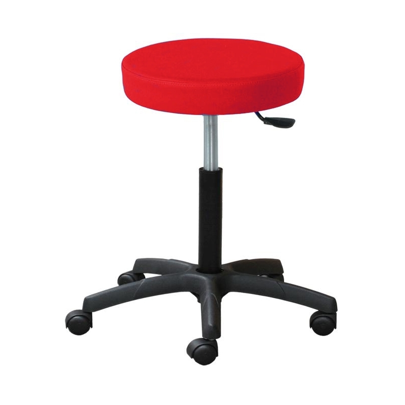 Questo sgabello ha un sedile di 33 cm e rivestito in skay. Regolabile in altezza per pistone a gas. Pistone metallico nero o al cromo. Base in plastico nero o di alluminio con 5 ruote di 50 mm.