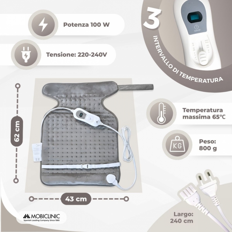 D'altra parte, ha tre impostazioni di temperatura. I cuscinetti riscaldanti forniscono un calore terapeutico, cioè leggermente più caldo del calore del corpo, ma mai più caldo di 38 gradi Celsius.
