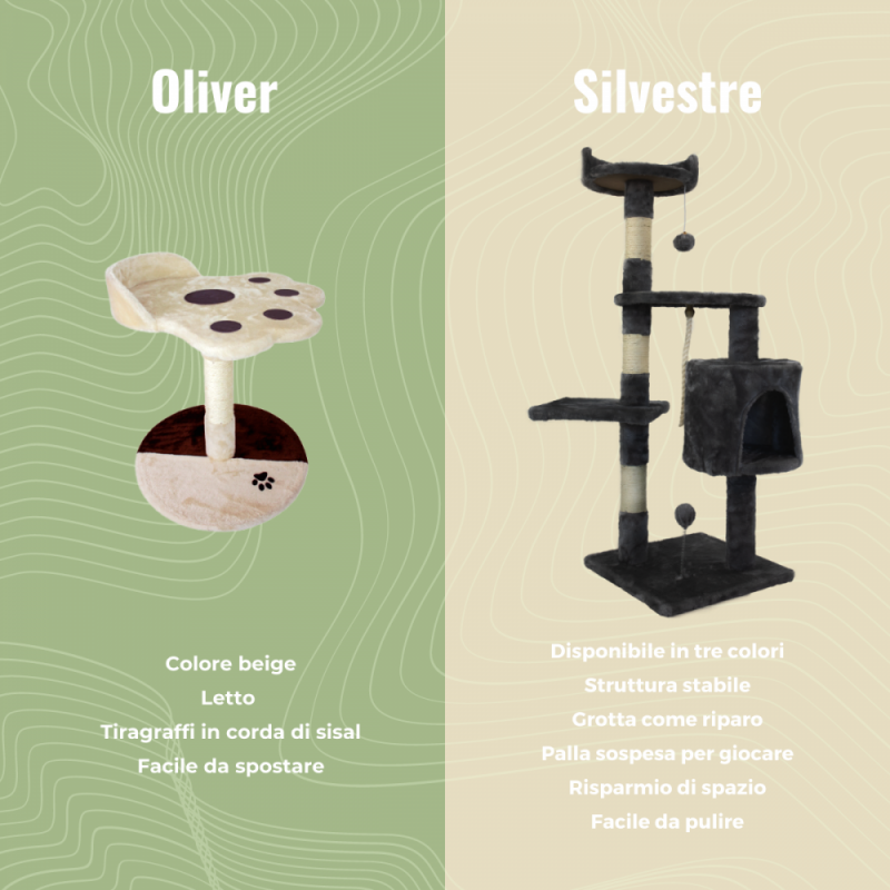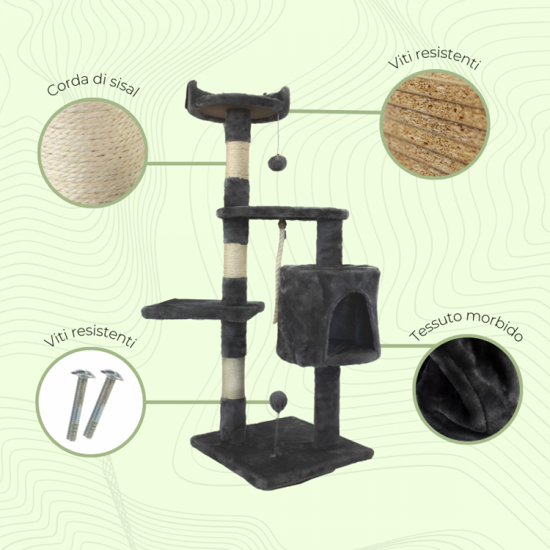 - Due colonne rialzate: le colonne perfezionano il design e aggiungono alla struttura una corda di sisal con cui il tuo gatto potrà giocare e rilassarsi.