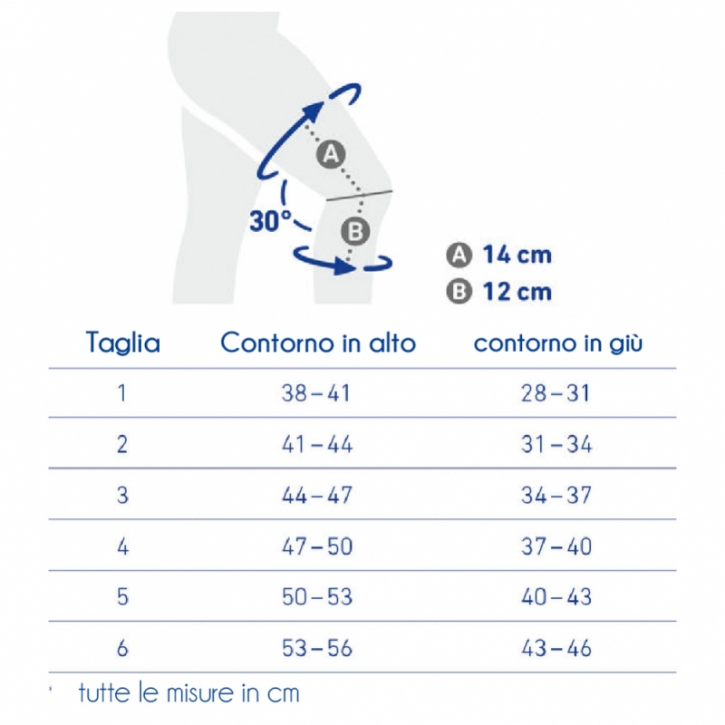 La taglia si basa sulla circonferenza della coscia, misurandone 2 punti: la parte superiore della coscia e la parte inferiore.