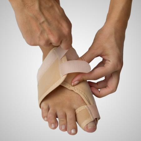 Questa ortesi correttiva notturna viene utilizzata per allineare la deviazione in valgo dell'alluce. Ha una conformazione anatomica che avvolge tutto il piede. Include stecca di allineamento e area imbottita per il primo dito. È realizzato in morbido velluto e ha una chiusura in microvelcro.