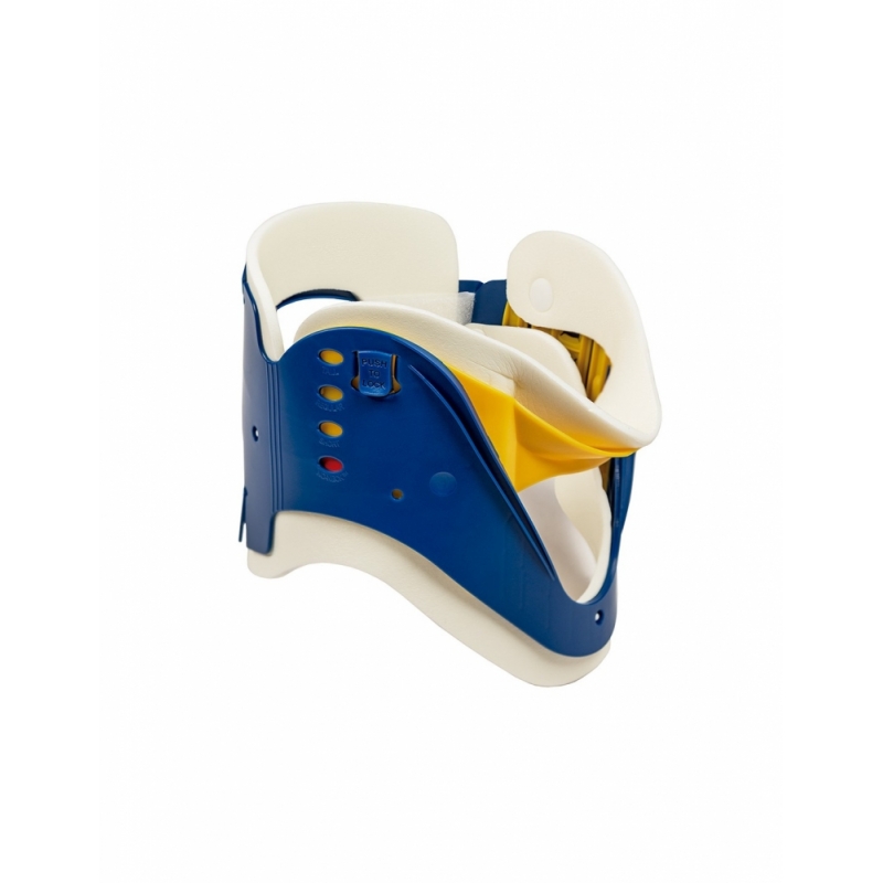 Completamente regolabile in 4 posizioni. Limita la mobilità del paziente, evitando lesioni cervicali aggravanti. Presenta un'ampia apertura frontale, per la pratica della tracheotomia.