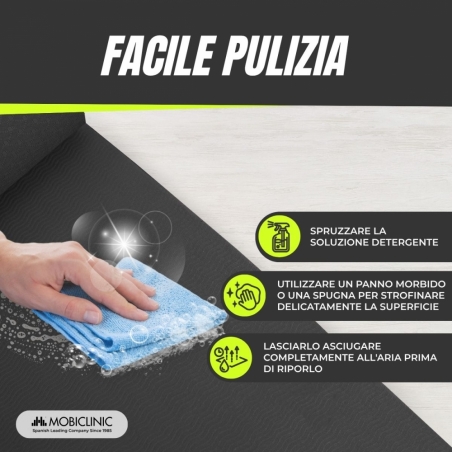 Questo tappetino è molto facile da lavare, pertanto, una volta terminato l'esercizio sarà sufficiente inumidire un panno insaponato e passarlo sul tappetino per poi sciacquarlo e asciugarlo bene con un panno asciutto. In questo modo potrai conservare il tuo tappetino affinché resti come nuovo.