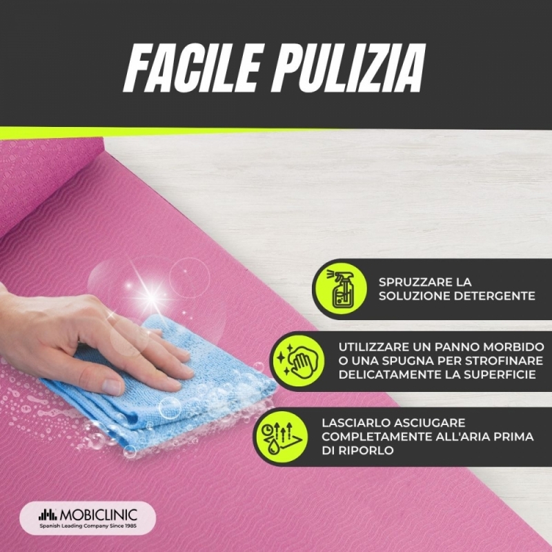 Una volta finito l'esercizio, questo tappetino è molto facile da lavare, dato che basta strofinarlo con un panno con acqua e sapone, poi sciacquarlo e infine asciugarlo con un panno asciutto. In questo modo, puoi mantenere il tuo tappetino in ottime condizioni come il primo giorno.