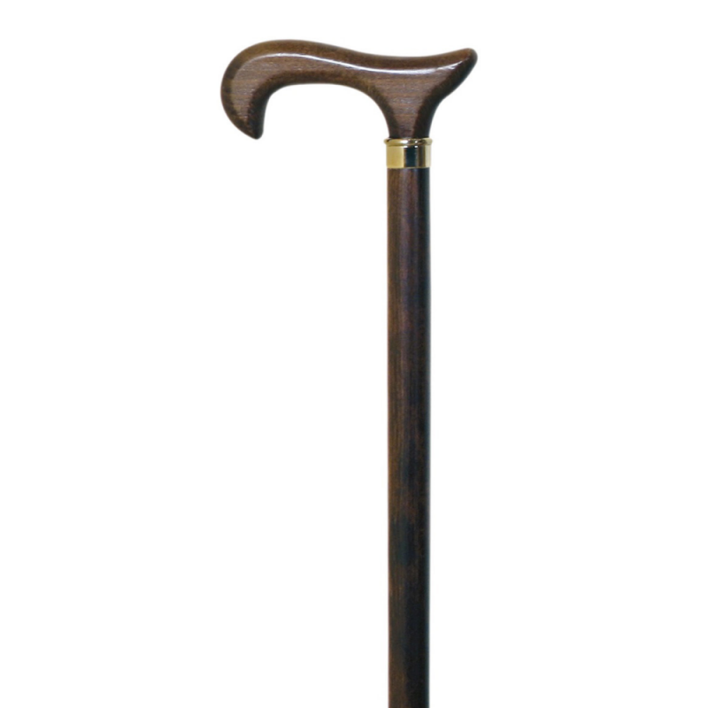 Questo bastone di colore marrone è fabbricato in faggio con impugnatura derby.
