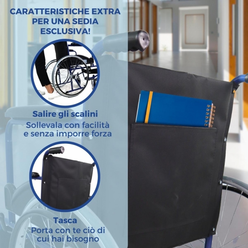 La sua seduta e lo schienale ergonomici svelano la praticità e il comfort di questa sedia a rotelle. Le ruote sono solide e non hanno bisogno di essere gonfiate, quindi sono più resistenti delle tradizionali ruote pneumatiche.