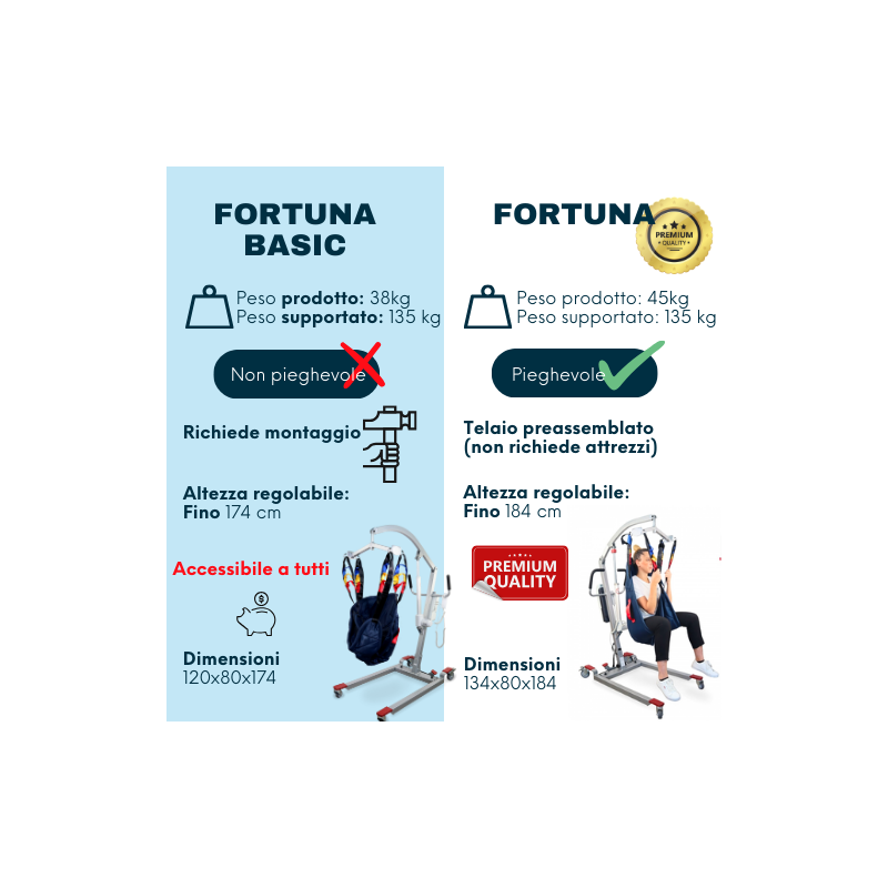 Il sollevatore ortopedico Fortuna Basic viene fornito smontato ed è facile da usare, grazie ai suoi comandi intuitivi . Utilizzando il telecomando , è possibile controllare il braccio di sollevamento semplicemente premendo i pulsanti "su" e "giù". Include anche un pulsante di emergenza per il sollevamento o l'abbassamento manuale del paziente, per riportarlo nella posizione originale. Il sollevatore si arresta una volta rilasciati i pulsanti. Questo permette a chiunque di imparare rapidamente a utilizzarlo.