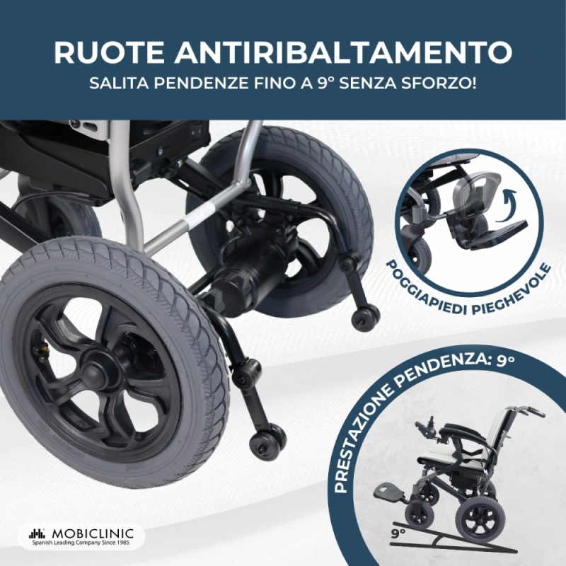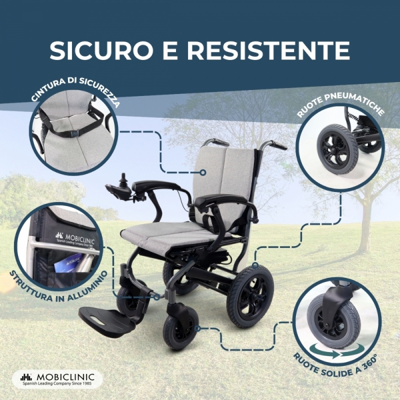 DESIGN VERSATILE E SICUREZZA: Il telaio in alluminio è molto robusto, ideale per una sedia a rotelle pieghevole leggera. Inoltre, la sedia a rotelle elettrica è pieghevole per un facile stoccaggio e trasporto. I braccioli fissi garantiscono stabilità. Il potente motore garantisce una guida fluida ed efficiente, mentre il freno elettromagnetico, così come le ruote antiribaltamento, offrono maggiore sicurezza in diverse situazioni.