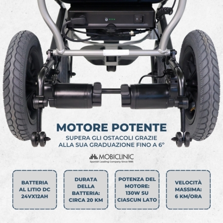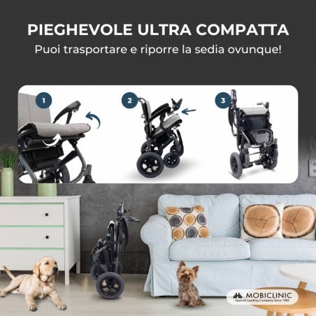 TECNOLOGIA AVANZATA : è dotata di un vano batteria a sgancio rapido, una caratteristica essenziale per una sedia a rotelle elettrica pieghevole. Il faro anteriore ricaricabile tramite USB integrato garantisce un'ottima visibilità. La velocità massima è di 6 km/h e l'autonomia è di 20 km.
