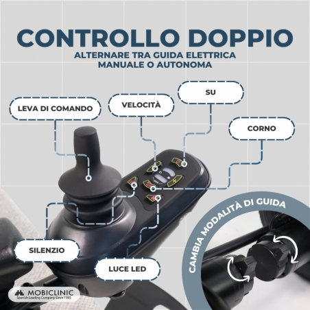 Il suo design innovativo si adatta al tuo stile di vita con una doppia modalità che consente la guida manuale o elettrica (in modo che il passeggero, se necessario, possa spingerla) e la guida elettrica autonoma , offrendoti la flessibilità necessaria in ogni momento.