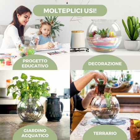 ESPLORA LA TUA CREATIVITÀ ACQUATICA: usa il nostro acquario rotondo Nemo come strumento educativo, giardino acquatico , affascinante microecosistema o centrotavola decorativo con pietre, conchiglie e luci LED sommergibili. Puoi anche riempirlo con fiori, perle di vetro, biglie decorative o usarlo come terrario .