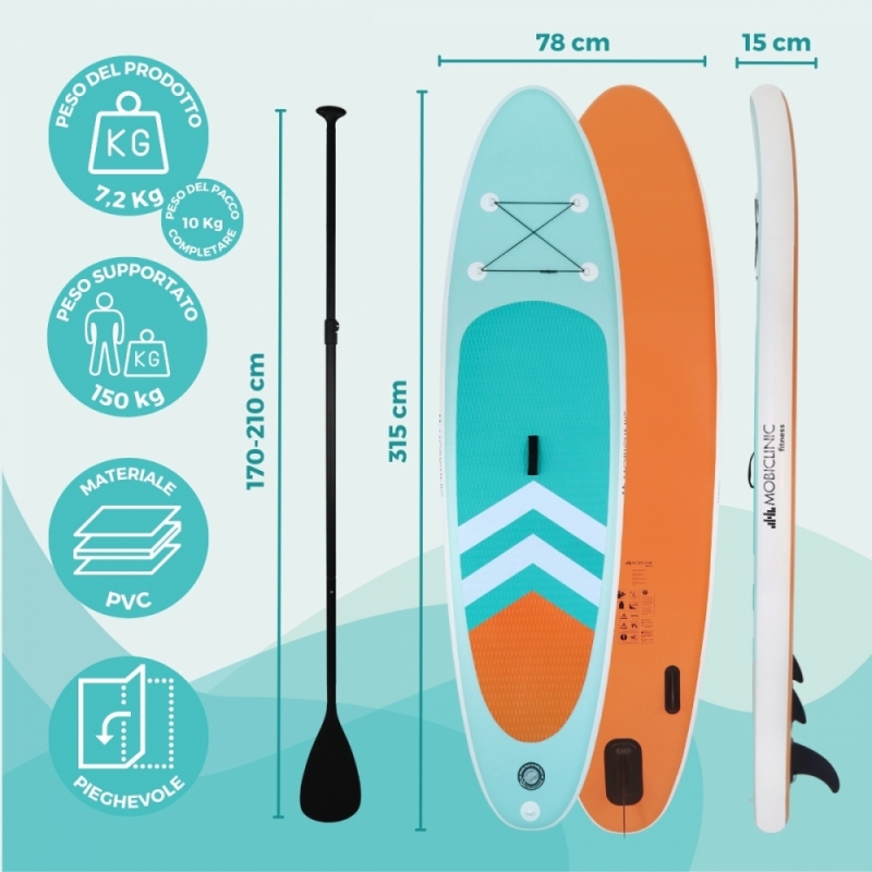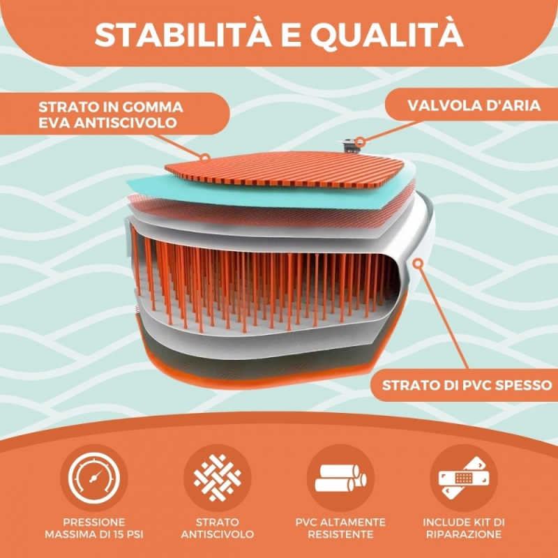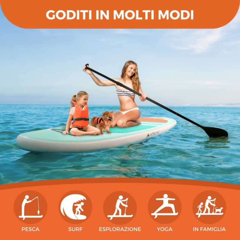 FACILE TRASPORTO: Grazie allo zaino incluso , portare la tua tavola da paddle surf ovunque è facile e senza problemi. Leggero e resistente, ti permette di esplorare nuove destinazioni acquatiche senza preoccuparti del trasporto. Inoltre, una volta gonfiato, potrai trasportarlo facilmente grazie alla sua maniglia per il trasporto .