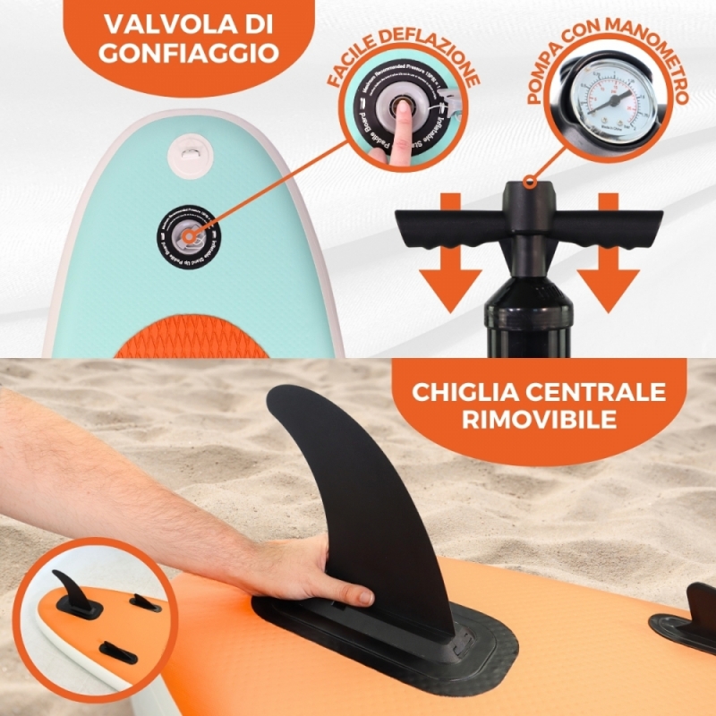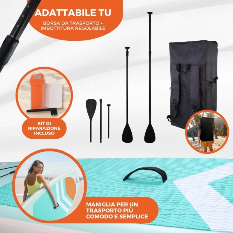 KIT COMPLETO: Il nostro esclusivo kit ti offre tutto il necessario per immergerti nell'emozionante esperienza del paddle surf gonfiabile . Dalla tavola agli accessori essenziali come la pompa con manometro e pagaia regolabile , abbiamo messo insieme tutto ciò di cui hai bisogno per iniziare subito la tua avventura acquatica. Include anche il kit di riparazione .