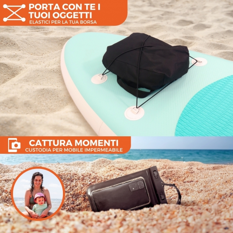 ESPERIENZA VERSATILE SULL'ACQUA : grazie alla sua eccezionale stabilità, lo stand up paddle Lilo è perfetto per una varietà di attività acquatiche, dallo yoga e il turismo costiero al portare con te i tuoi bambini o animali domestici . Inoltre, il suo design robusto lo rende ideale per la pesca tranquilla o per provare il surf in acque più dolci. Sulla spiaggia, su un lago , in una palude o in un fiume, puoi usare la pagaia e connetterti con la natura. Con la custodia per telefono acquatico inclusa, puoi catturare momenti indimenticabili, come fotografare i pesci mentre fai snorkeling.