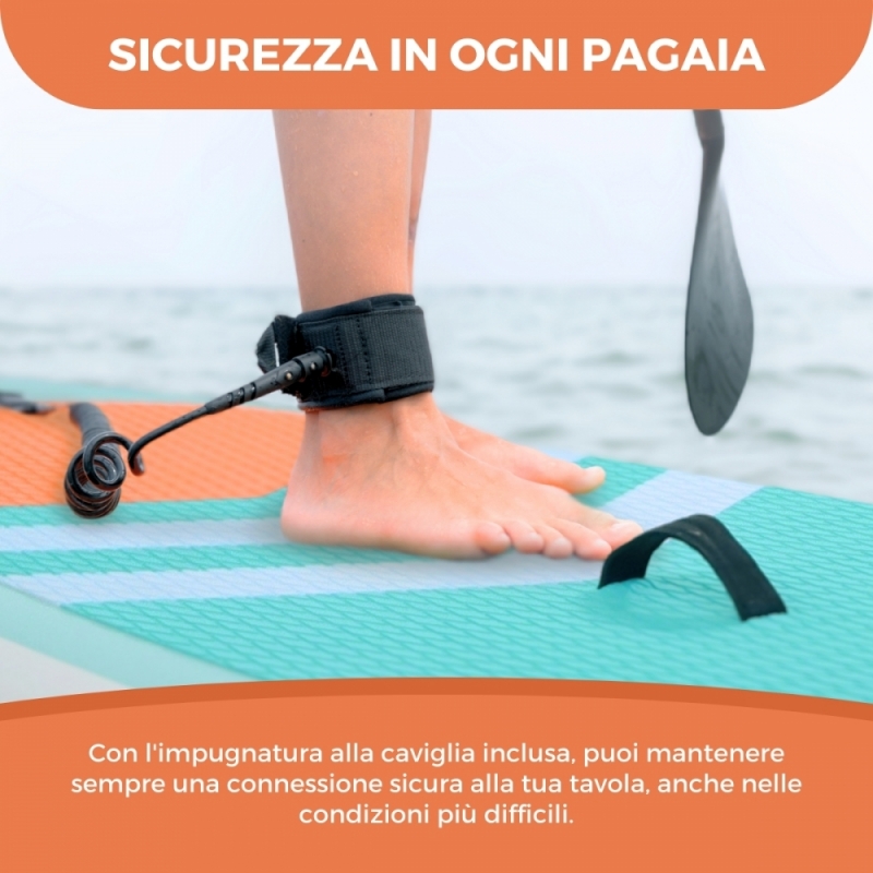 SICUREZZA IN OGNI PASSAGGIO: con la presa alla caviglia inclusa, puoi mantenere una connessione sicura alla tua tavola in ogni momento, anche nelle condizioni più difficili. L'impugnatura mantiene agganciata la tavola in caso di caduta o ribaltamento , impedendole di allontanarsi e potendo recuperarla facilmente. Questa funzione non solo fornisce ulteriore sicurezza, ma ti consente anche di concentrarti sul godimento del paesaggio e sul miglioramento della tua tecnica.