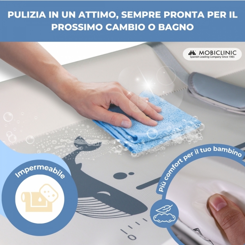 Una delle caratteristiche più notevoli di questo fasciatoio è la sua altezza regolabile in quattro posizioni (86, 89, 92 e 95 cm), che consente ai genitori di adattare il fasciatoio alla loro altezza ed evitare così sforzi alla schiena. Questa ergonomia non solo migliora il comfort durante il bagno e il cambio del pannolino, ma fornisce anche un ambiente più sicuro e confortevole per il bambino e i genitori. Inoltre, il materiale impermeabile e facile da lavare con cui è realizzato facilita la manutenzione quotidiana, consentendo una pulizia facile e veloce con un panno umido e sapone, che garantisce una maggiore durata del prodotto.