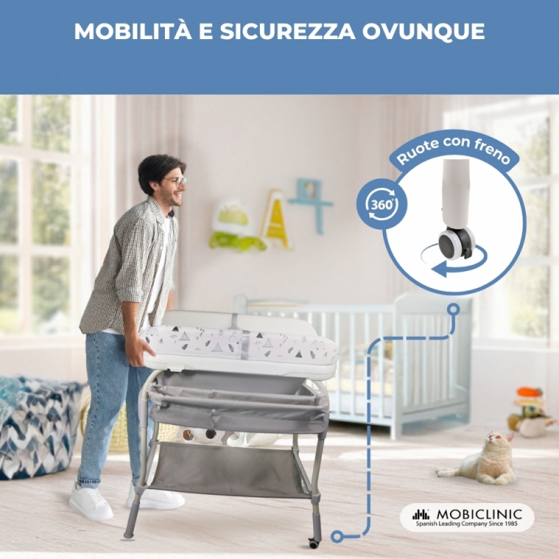 COMFORT ED ERGONOMIA: L'altezza regolabile in quattro posizioni (86, 89, 92 e 95 cm) permette di adattare il fasciatoio alle esigenze dei genitori, riducendo lo sforzo sulla schiena durante il bagnetto o il cambio del bambino, offrendo un comfort più confortevole esperienza.