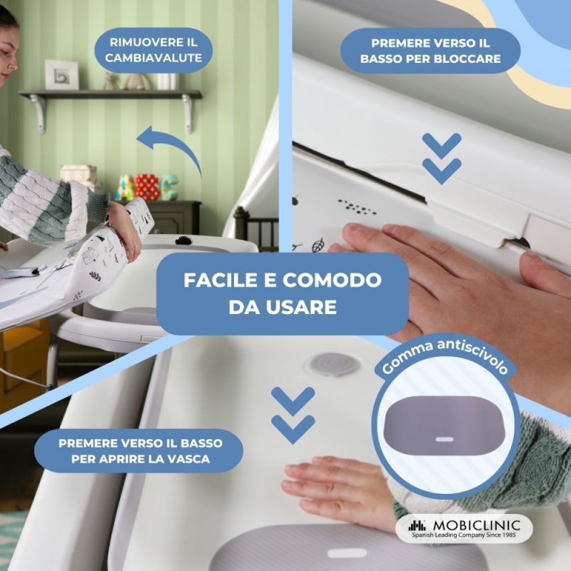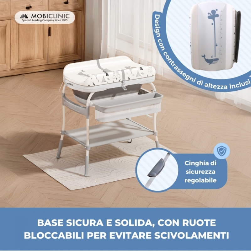 SICUREZZA E STABILITÀ: La struttura ad angoli retti e la cintura di sicurezza garantiscono totale stabilità durante l'utilizzo, mantenendo il bambino sempre al sicuro, sia durante il bagnetto che durante il cambio del pannolino.