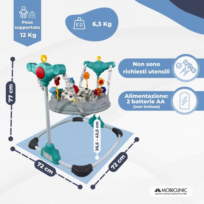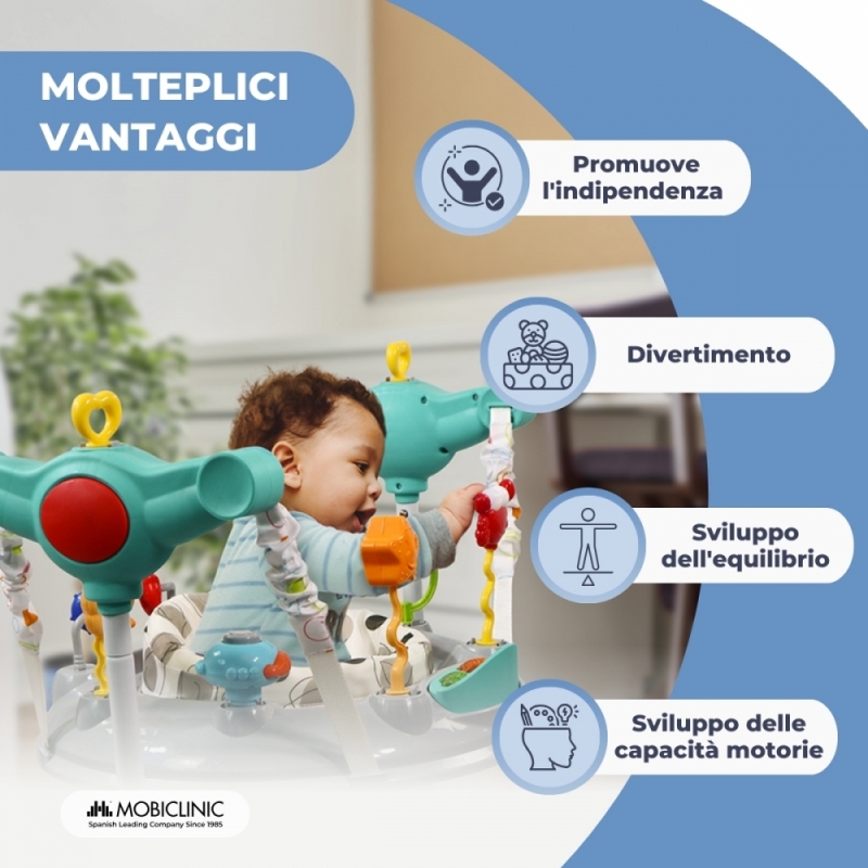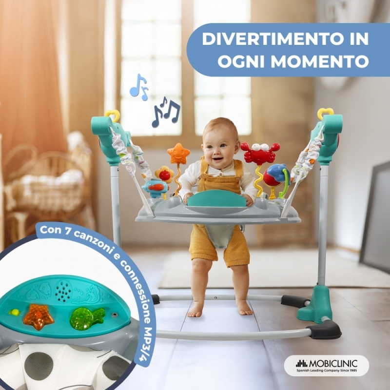 Questo jumper per neonati è perfetto per lo sviluppo e il divertimento dei più piccoli. Unisce apprendimento e divertimento, offrendo 8 giocattoli interattivi che stimolano le capacità motorie fini e dispone inoltre di 7 canzoni e luci integrate che aiutano nello sviluppo dei sensi.