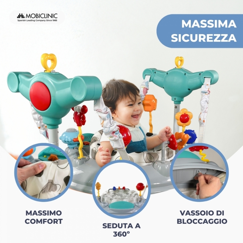 Dispone di 3 altezze regolabili che permettono al sdraietta di accompagnare il bambino durante la crescita, adattandosi alle sue esigenze e alle sue diverse fasi. Inoltre, questo garantisce che il bambino mantenga una postura corretta e sicura durante il gioco. La seduta ruota di 360º, offrendo al bambino la possibilità di esplorare l'ambiente circostante in modo completo e da qualsiasi angolazione, favorendo la coordinazione motoria.