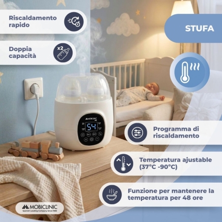 Tra le sue caratteristiche, il riscaldamento rapido, che aumenta la temperatura di 15 °C oltre quella impostata, garantendo un riscaldamento efficiente e costante. Offre inoltre una programmazione oraria, in modo che il biberon sia pronto all'ora desiderata.