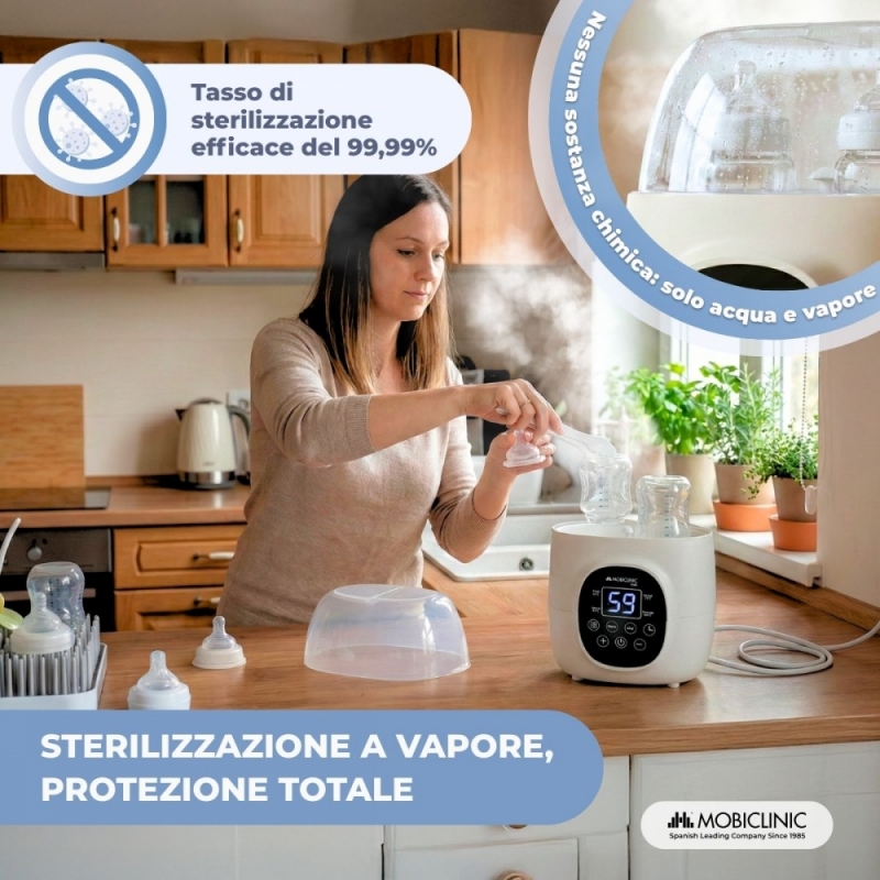 STERILIZZAZIONE SICURA: Questo scaldabiberon è dotato di un sistema di sterilizzazione a vapore ad alta temperatura con un'efficienza del 99,99%, che elimina batteri e germi. Perfetto per mantenere sterilizzati gli utensili per bambini come ciucci e biberon senza bisogno di dispositivi aggiuntivi.