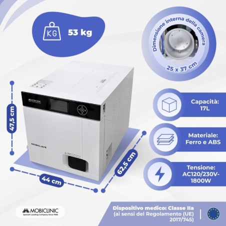 STERILIZZAZIONE PROFESSIONALE E COMPLETA: L'autoclave Mobiclinic da 17 litri disinfetta utilizzando vapore saturo al 99%, eliminando microrganismi, virus, funghi e spore. È ideale per ambienti professionali come studi dentistici e medici, laboratori, cliniche ortopediche e centri veterinari.