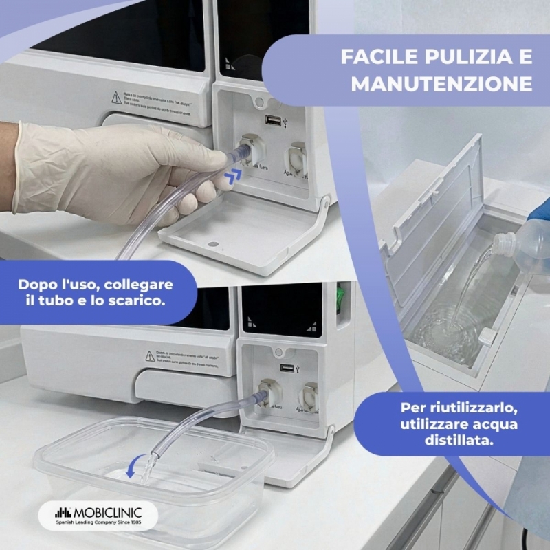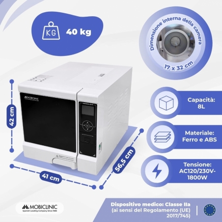 L' autoclave sterilizzante Mobiclinic da 8 litri è una soluzione professionale che offre una sterilizzazione completa, efficace e sicura , progettata per tutti i tipi di ambienti clinici. Utilizza vapore saturo al 99% per inattivare batteri, virus, funghi e spore , garantendo un processo di pulizia affidabile anche negli ambienti più esigenti.
