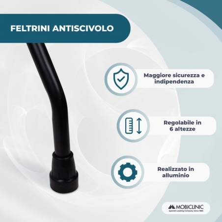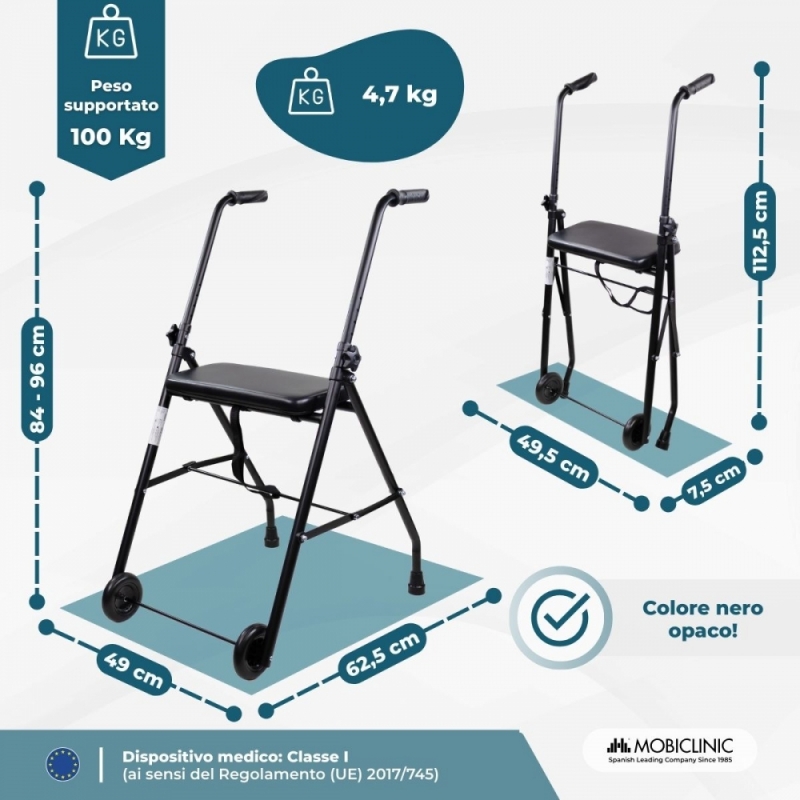 ELEGANTE DESIGN NERO OPACO: Questo deambulatore non solo ti accompagna ad ogni passo, ma si distingue anche per la sua sofisticata e moderna finitura nero opaco . Offre un tocco distintivo rispetto ai modelli tradizionali, integrandosi facilmente in qualsiasi ambiente senza rinunciare allo stile. Ideale per chi apprezza sia la funzionalità che l'estetica.
