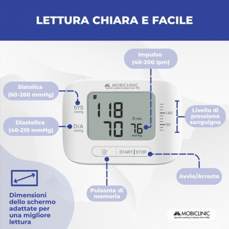 Utilizzare questo misuratore di pressione sanguigna è semplicissimo, con un solo pulsante di accensione e un pulsante di memoria, che consentono una misurazione senza problemi. Il suo display LCD digitale mostra chiaramente i risultati, insieme a diverse icone che indicano gonfiaggio/sgonfiaggio, memoria, frequenza cardiaca e batteria.