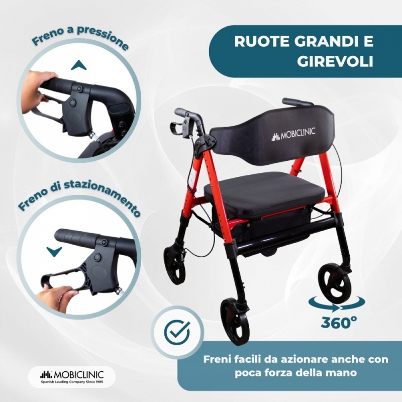 Il sistema di chiusura è semplice e veloce: basta azionare la barra sotto la seduta per compattare il deambulatore e trasportarlo o riporlo senza sforzo. Le ruote anteriori piroettanti da 8 pollici con rotazione a 360 gradi offrono un'ottima manovrabilità, mentre le ruote rimovibili consentono di risparmiare spazio.