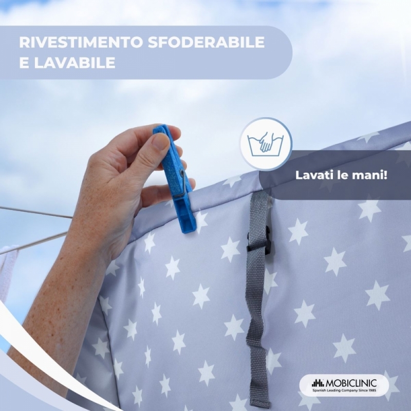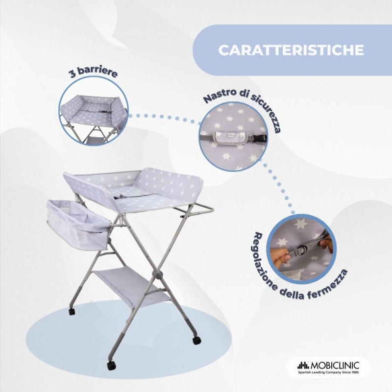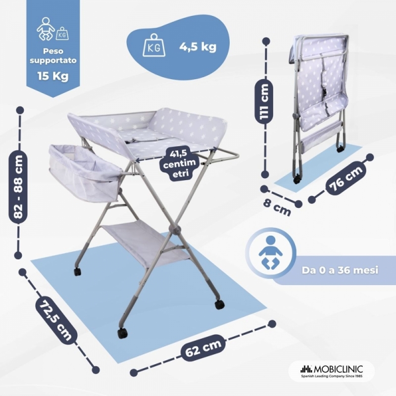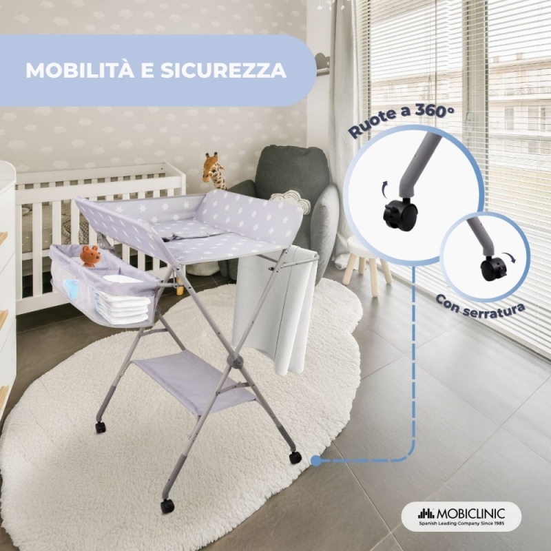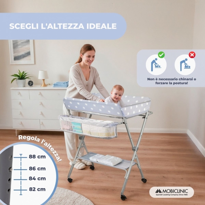 Uno dei suoi grandi vantaggi è la possibilità di regolarlo in cinque altezze: 82, 84, 86, 88 e 90 cm, adattandolo all'altezza e alle esigenze di ogni utente e garantendo una postura comoda durante l'uso, con meno sforzo e disagio. Inoltre, le sue quattro ruote piroettanti a 360° facilitano lo spostamento del fasciatoio e i suoi freni offrono maggiore stabilità e sicurezza durante l'uso.