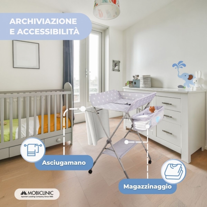 FUNZIONALE E PIEGHEVOLE: Questo fasciatoio è dotato di un capiente cestello laterale, di una barra portasciugamani e di un ripiano inferiore con più spazio per organizzare tutti i prodotti per l'igiene del tuo bambino. Si piega facilmente, occupando il minimo spazio, e la sua copertura è rimovibile, consentendo una pulizia ottimale ed efficace.