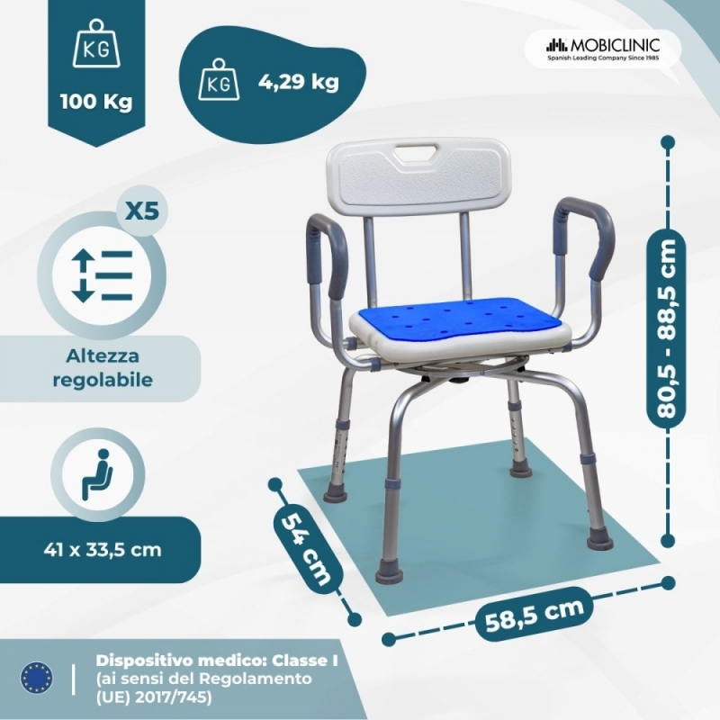 Lo sgabello da bagno girevole Akila offre comfort e sicurezza sotto la doccia e per l'igiene personale, ideale per anziani, persone in fase di riabilitazione o persone con mobilità ridotta. Grazie alla seduta girevole, è possibile effettuare movimenti fluidi e sicuri senza dover ruotare il corpo, riducendo il rischio di cadute o lesioni. Incorpora un sistema di bloccaggio di sicurezza che impedisce movimenti indesiderati e offre maggiore stabilità all'utente durante l'utilizzo.