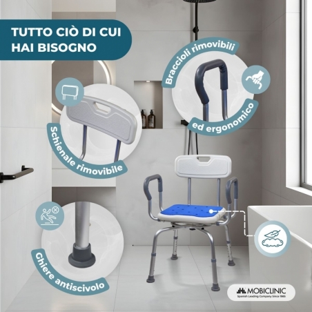 COMFORT E SUPPORTO EXTRA: Questa sedia da bagno è dotata di braccioli ergonomici che offrono un supporto eccellente quando ci si alza o ci si siede, offrendo sicurezza e prevenendo la tensione. La seduta e lo schienale hanno una superficie antiscivolo in EVA che offre un supporto comodo e morbido, anche in ambienti umidi.