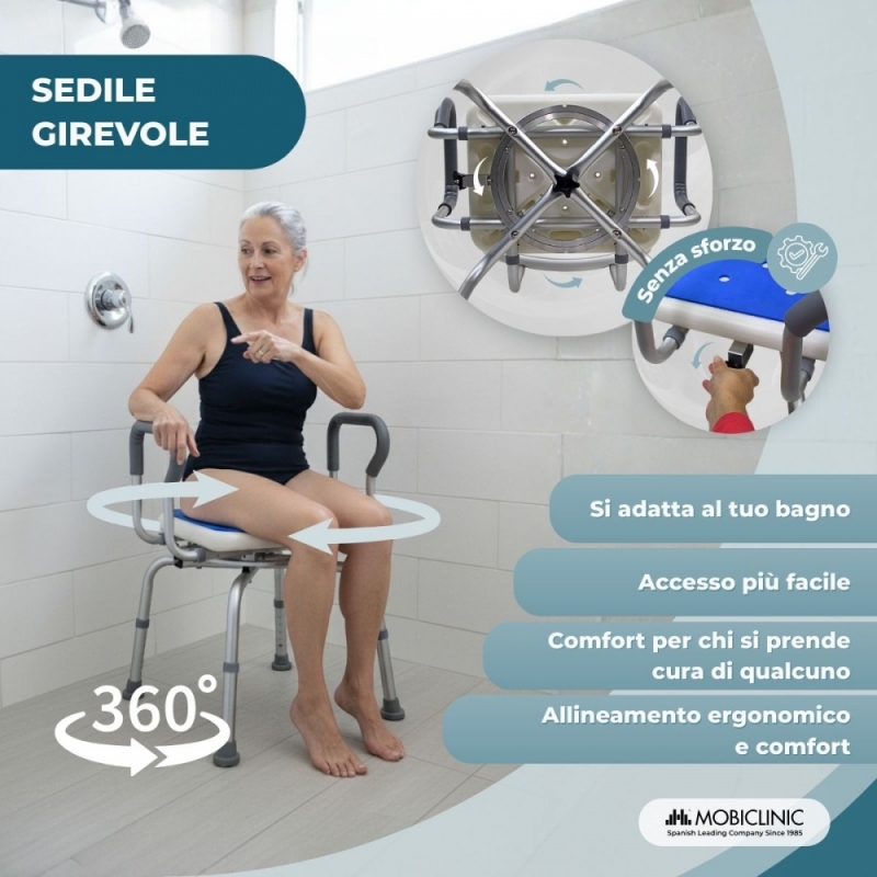 SEDILE GIREVOLE A 360°: Lo sgabello da bagno è dotato di un sedile girevole che consente di cambiare posizione senza dover ruotare il corpo, riducendo il rischio di cadute o lesioni. Per una maggiore sicurezza, è inoltre dotato di un sistema di bloccaggio che mantiene la stabilità del sedile durante l'uso, per una maggiore sicurezza e controllo.
