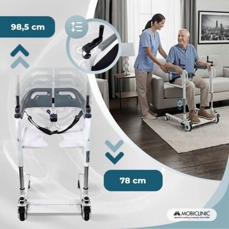 La sedia da trasferimento Willy con comoda è una soluzione che facilita le attività di assistenza e mobilità a casa o in ambito clinico. La sua altezza è regolabile tra 79 e 99 cm tramite manovelle sincronizzate che regolano l'elevazione in modo preciso e fluido, adattandosi a letti, sedie a rotelle, divani o poltrone. Questo sistema protegge l'assistente, rendendo il processo più confortevole e sicuro.