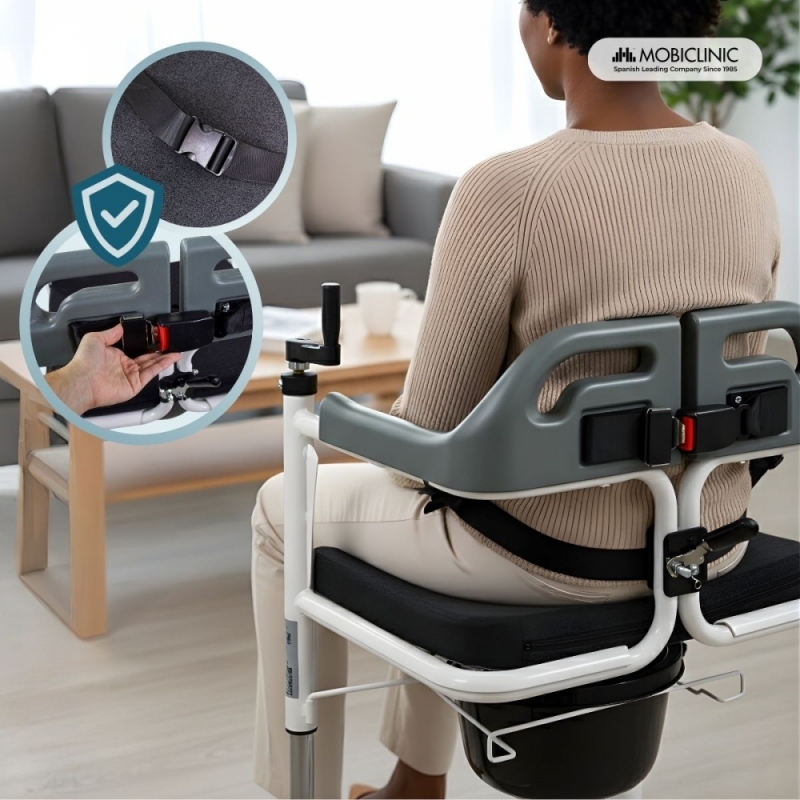 È dotato di un doppio sistema di sicurezza, costituito da una cintura posteriore regolabile che trattiene saldamente l'utente e da un meccanismo di bloccaggio automatico del telaio. È inoltre dotato di freni di bloccaggio su tutte e quattro le ruote per una maggiore stabilità durante i trasferimenti, impedendo movimenti indesiderati.