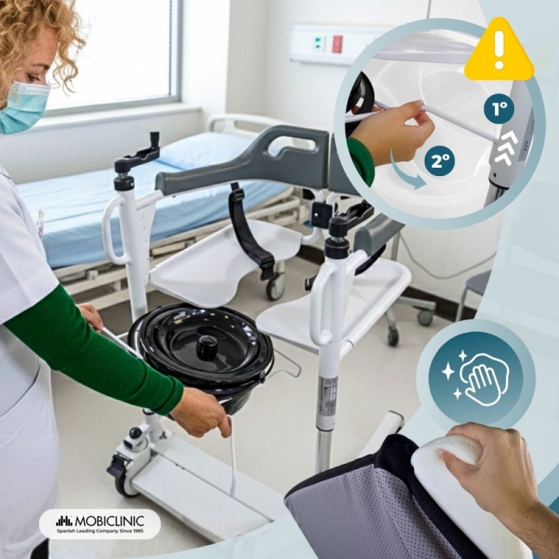 L'ampia apertura e il meccanismo di chiusura rapida consentono un facile posizionamento dell'utente, riducendo lo sforzo fisico per l'assistente. Include inoltre un cuscino imbottito rimovibile e lavabile, perfetto per mantenere l'igiene in ogni momento, e un vassoio comodo rimovibile, che trasforma la sedia in un pratico e funzionale bagno portatile. IMPORTANTE : rimuovere il telaio metallico e il vassoio prima di aprire la struttura della sedia.