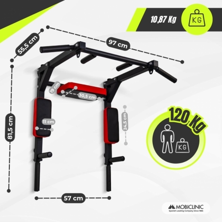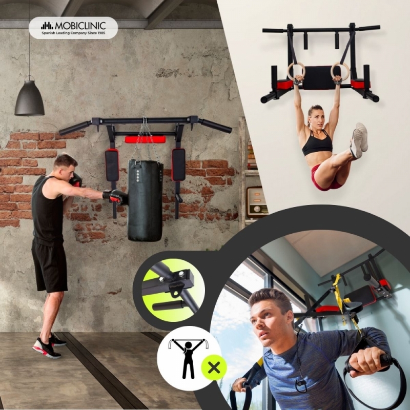 Il suo telaio in acciaio rinforzato offre grande resistenza e supporta fino a 120 kg, ideale per principianti e utenti avanzati. Inoltre, il suo sistema di ancoraggio a quattro ganci offre una presa salda e sicura, impedendo il movimento. Le sue maniglie ergonomiche sono rivestite in schiuma antiscivolo per garantire comfort e maggiore controllo durante l'esercizio. Include anche due fori di ancoraggio laterali che ampliano le possibilità di allenamento collegando elastici, carrucole o sacchi da boxe.