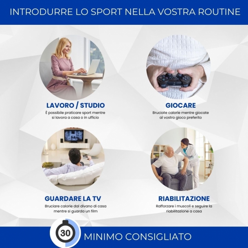 IDEALE PER: persone che sono abitualmente a casa o non possono spostarsi fuori casa e che hanno bisogno di fare attività fisica per mantenere buone abitudini.