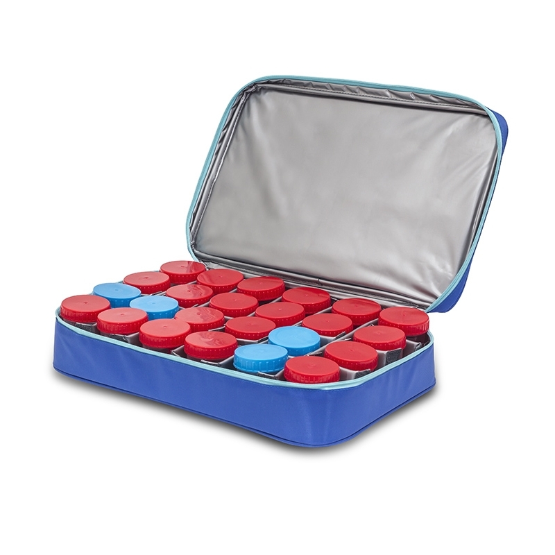 Il suo design cubico permette di trasportare differenti tipi di campioni allo stesso tempo. Infatti, è dotata di quattro scompartimenti estraibili e una tasca esterna trasparente per l'etichettatura.