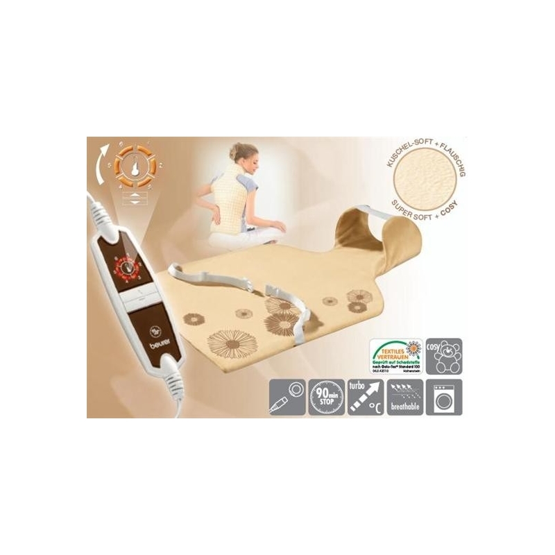Cuscinetto riscaldante schiena/cervicale traspirante, flessibile e piacevole al tatto. Il suo design ergonomico e la sua cintura permettono la massima regolazione. Funziona con un innovativo sistema di controllo della temperatura a LED con luce. 6 interruttori di potenza e sistema di riscaldamento ultra-veloce. Funzione di spegnimento automatico dopo circa 90 minuti di funzionamento. Protezione dal surriscaldamento. Elemento riscaldante morbido e soffice in microfibra felpata. Lavabile in lavatrice grazie al cavo di alimentazione rimovibile. Il rivestimento in morbido cotone è sfoderabile e lavabile in lavatrice a 30°C. I cuscinetti riscaldanti forniscono un calore terapeutico, cioè un calore leggermente superiore a quello del corpo, ma mai superiore ai 38 gradi Celsius. Inoltre, per l'uso del pad, in particolare nella zona cervicale, si deve prestare particolare attenzione a non fornire una temperatura elevata, in quanto può causare vasodilatazione a causa dell'aumento della temperatura, con conseguente calo della pressione sanguigna e persino produrre vertigini.