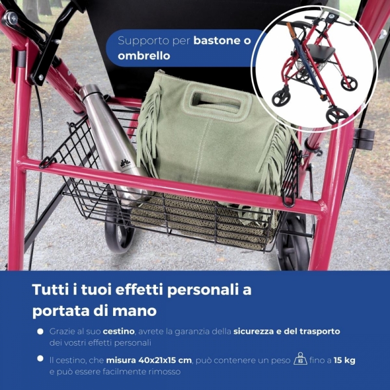 Questo deambulatore ha anche un fantastico cestino in cui puoi riporre tutti i tuoi effetti personali senza problemi, in modo sicuro e comodo mentre cammini. Inoltre è regolabile in altezza, il che lo rende ancora più pratico in quanto adattabile alle esigenze di ogni utilizzatore.