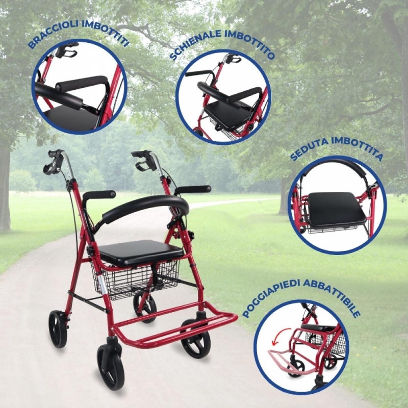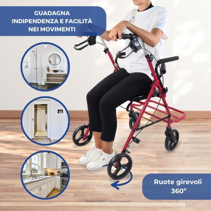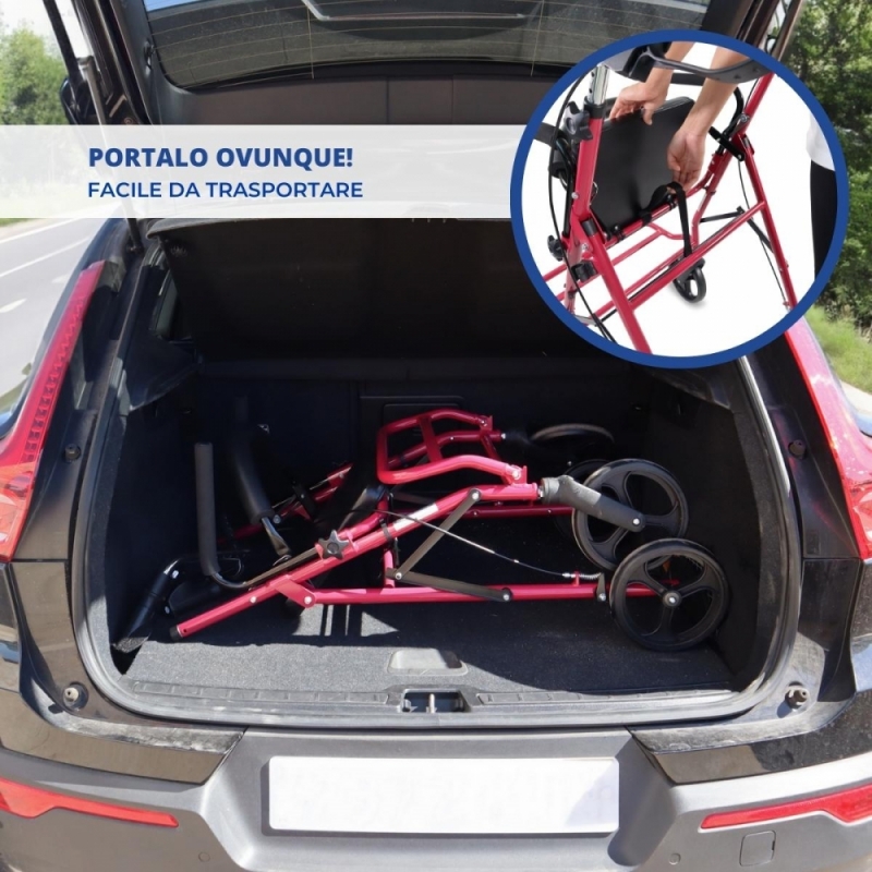 Infine, questo deambulatore 4 ruote ha la capacità di piegarsi e, grazie al suo materiale leggero, lo rende facile da trasportare.
