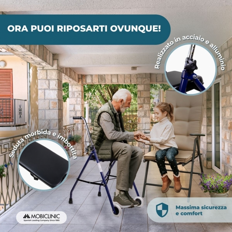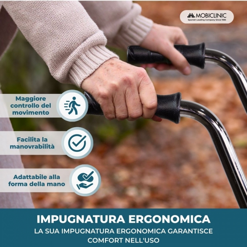 Il deambulatore per adulti Emérita di Mobiclinic è dotato di due ruote che garantiscono la stabilità necessaria durante le passeggiate. È inoltre dotato di un sedile imbottito in PVC che consente di riposare quando necessario. Le maniglie ergonomiche sono regolabili in altezza da 84,2 cm a 96 cm, per adattarsi alle proprie esigenze.