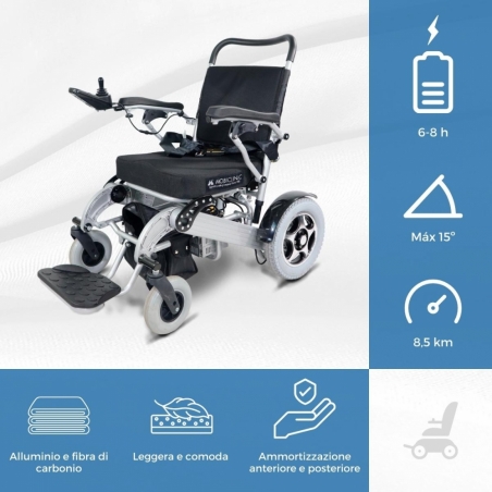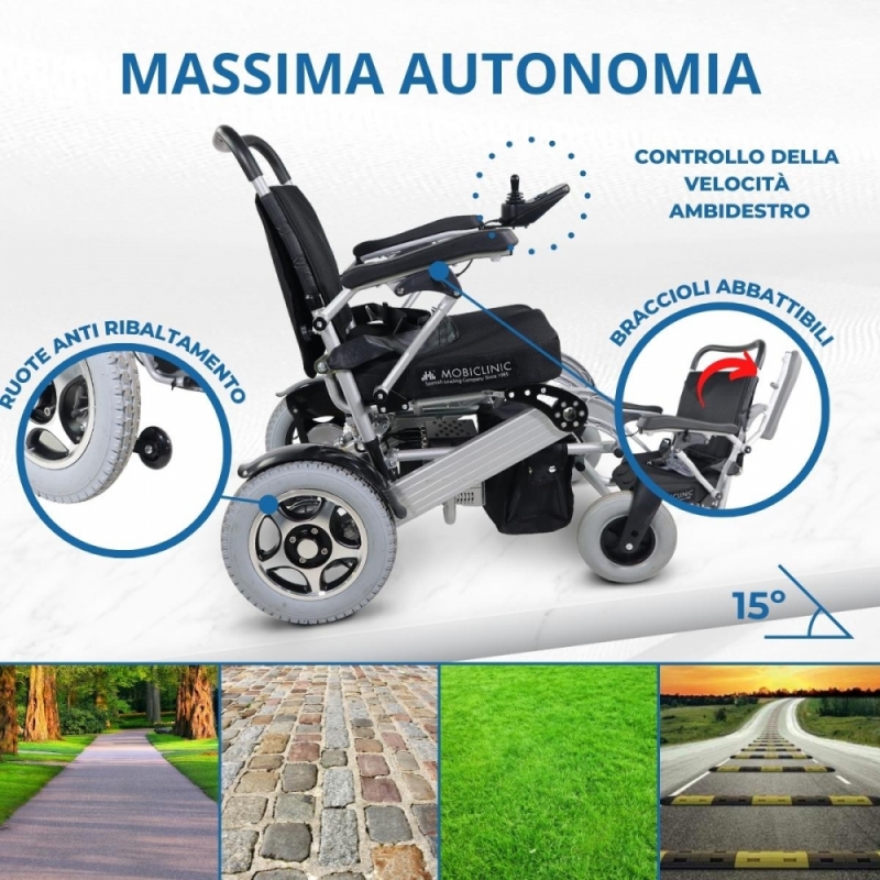 La sedia a rotelle elettrica Troya Plus Ultra di Mobiclinic è stata progettata per garantire comfort e mobilità su tutti i tipi di terreno. Grazie al suo peso (senza batterie) di soli 24,8 kg e al pratico sistema di ripiegamento in avanti, puoi trasportare questa sedia in qualsiasi bagagliaio e utilizzarla ovunque tu ne abbia bisogno. Inoltre, quando non la usi, puoi riporre questa sedia pieghevole in qualsiasi punto della casa senza problemi.