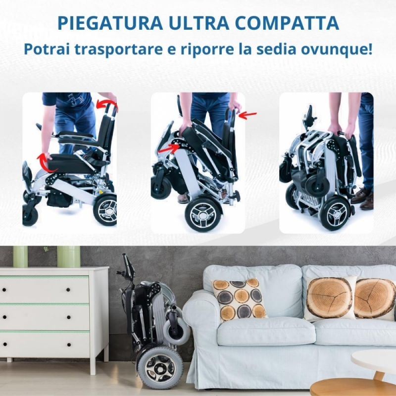 PIEGHEVOLE: la sedia a rotelle Troya può essere facilmente ripiegata manualmente, con la batteria rivolta in avanti, occupando il minimo spazio. Questo la rende facile da trasportare o riporre ovunque.