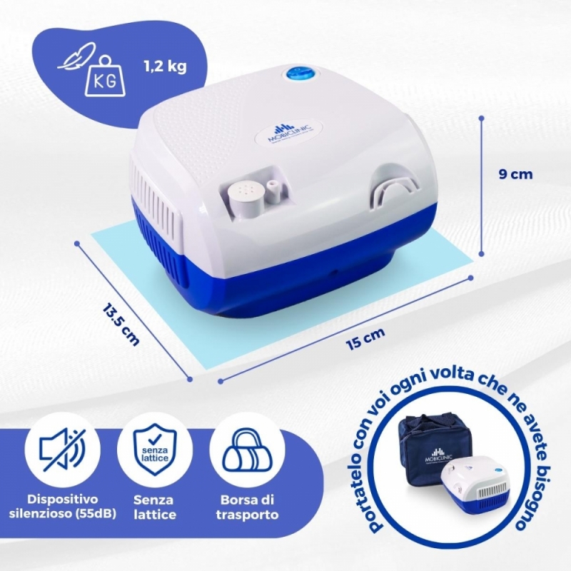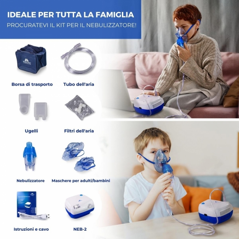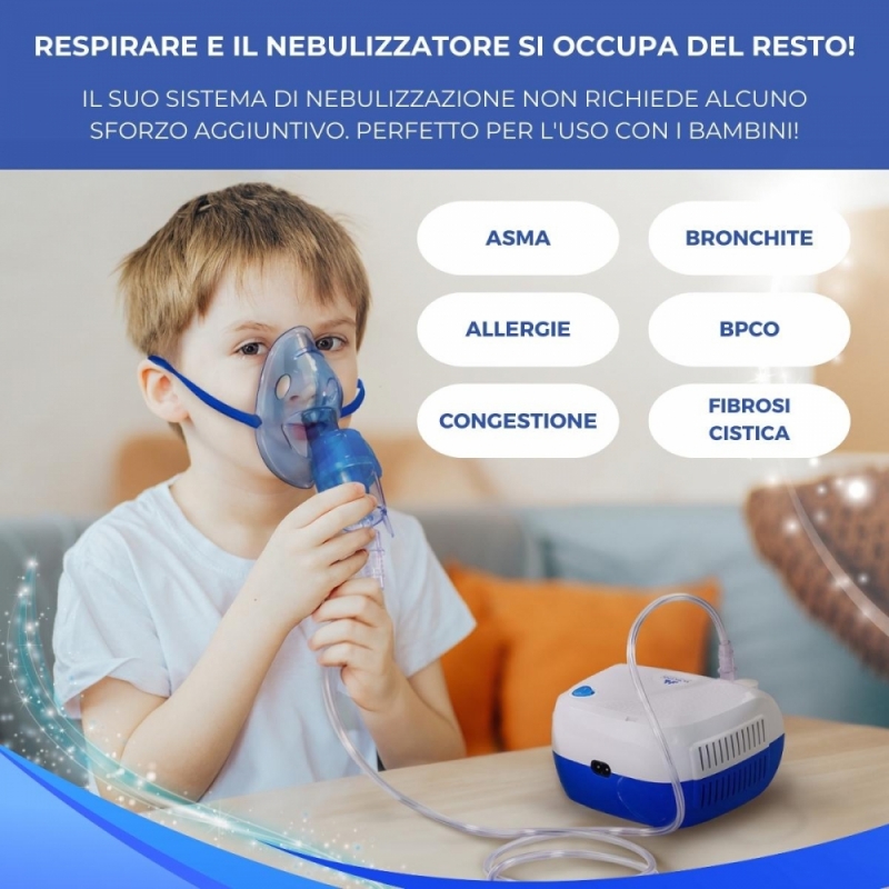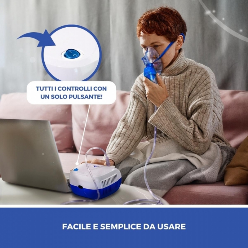 È ideale per la cura delle malattie respiratorie offrendo una grande capacità inalatoria per un breve periodo di tempo. È un aerosol silenzioso, che può essere usato sia per adulti che per bambini (aerosol bambini)