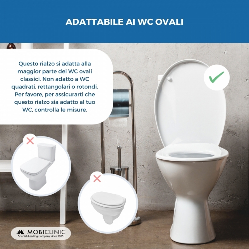 Il rialzo water universale si adatta alla maggior parte dei servizi igienici, semplicemente regolando le due manopole laterali.